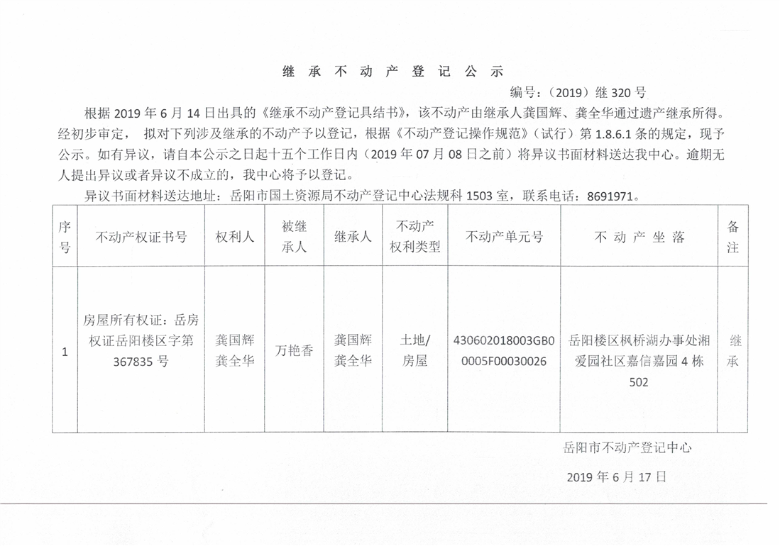 继承不动产登记公示 编号:(2019)继320号(龚全华)
