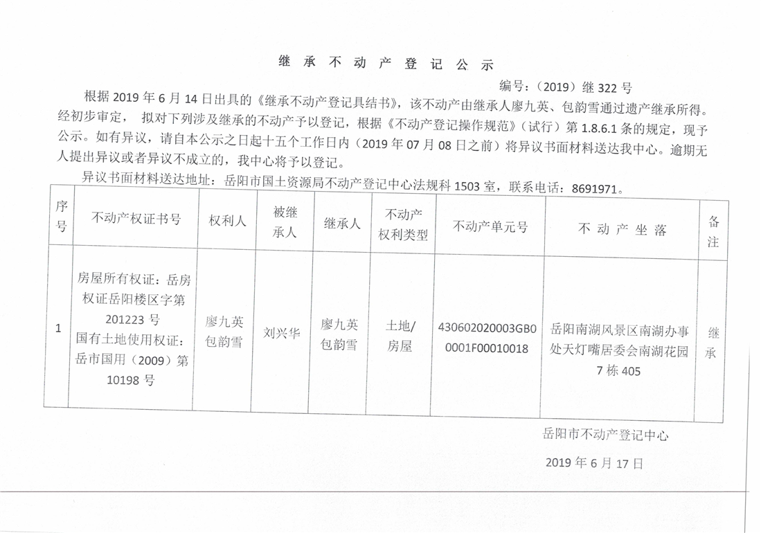 继承不动产登记公示 编号:(2019)继322号(廖九英)