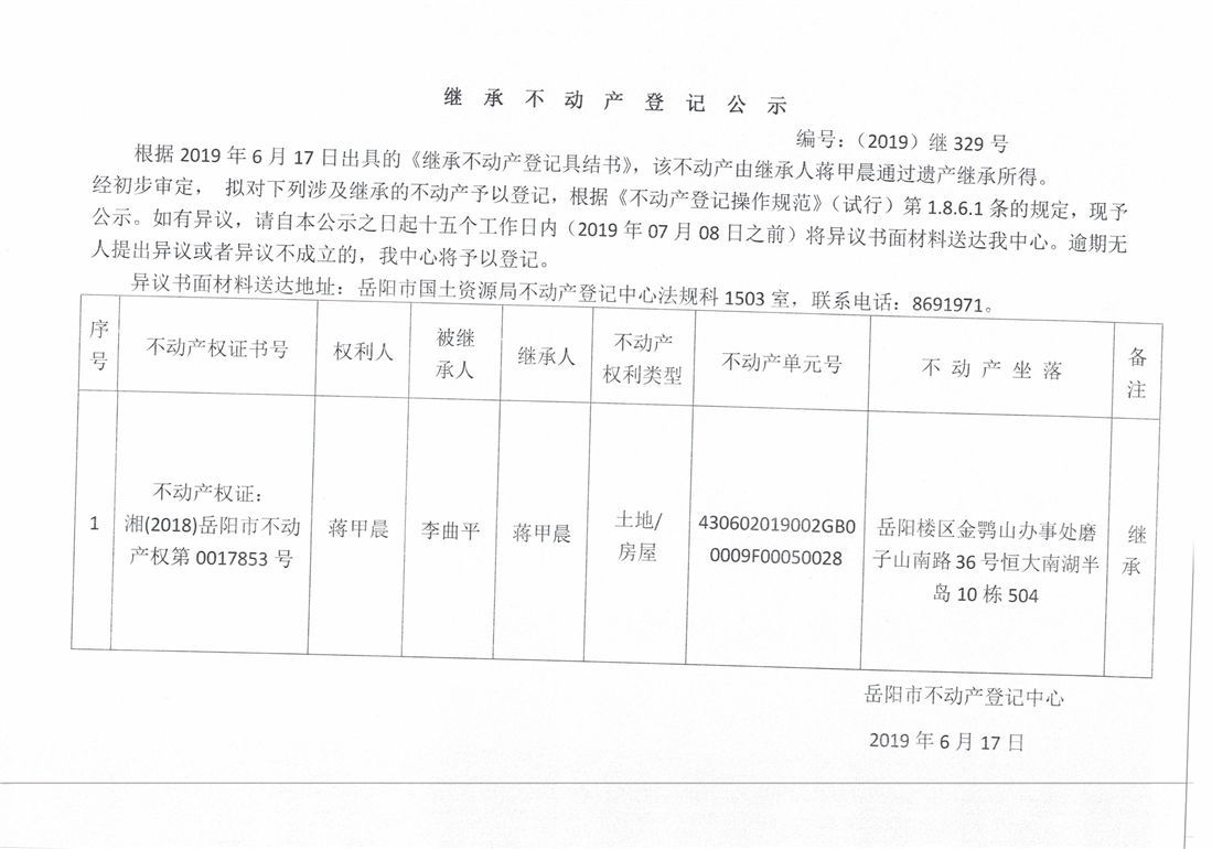 继承不动产登记公示 编号:(2019)继329号