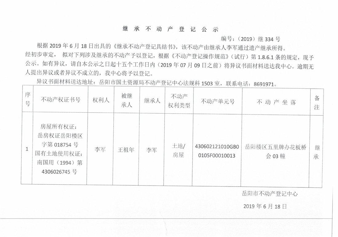 继承不动产登记公示 编号:(2019)继334号