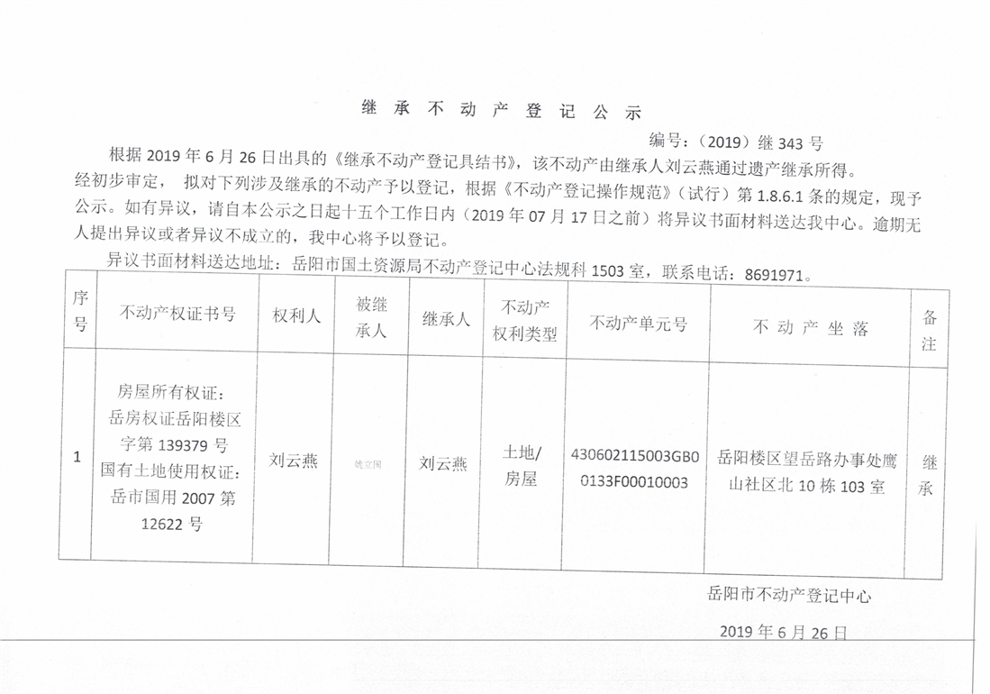 继承不动产登记公示 编号:(2019)继号343号