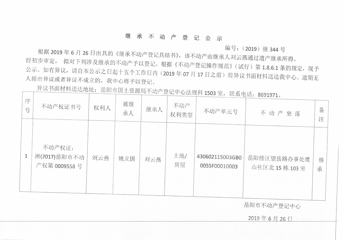 继承不动产登记公示 编号:(2019)继号344号