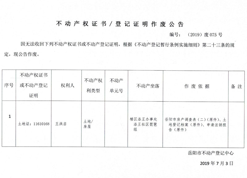 不动产权证书、登记证明作废公告 编号: (2019)废075号