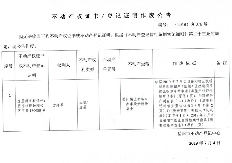不动产权证书、登记证明作废公告 编号: (2019)废076号
