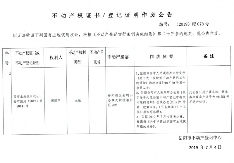 不动产权证书、登记证明作废公告 编号: (2019)废078号