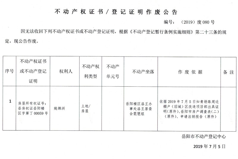 不动产权证书、登记证明作废公告 编号: (2019)废080号