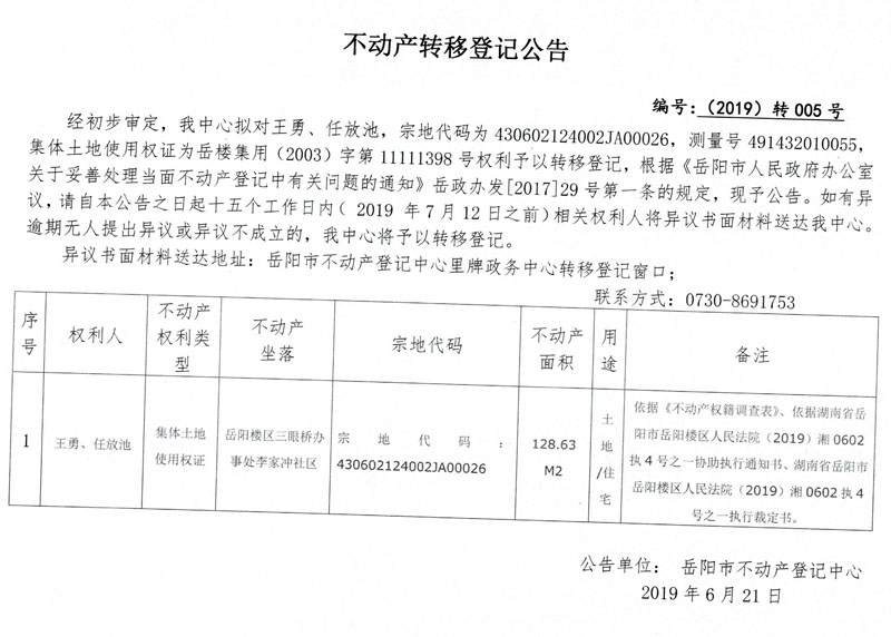不动产转移登记公告 编号:(2019)转005号(王勇、任放池)