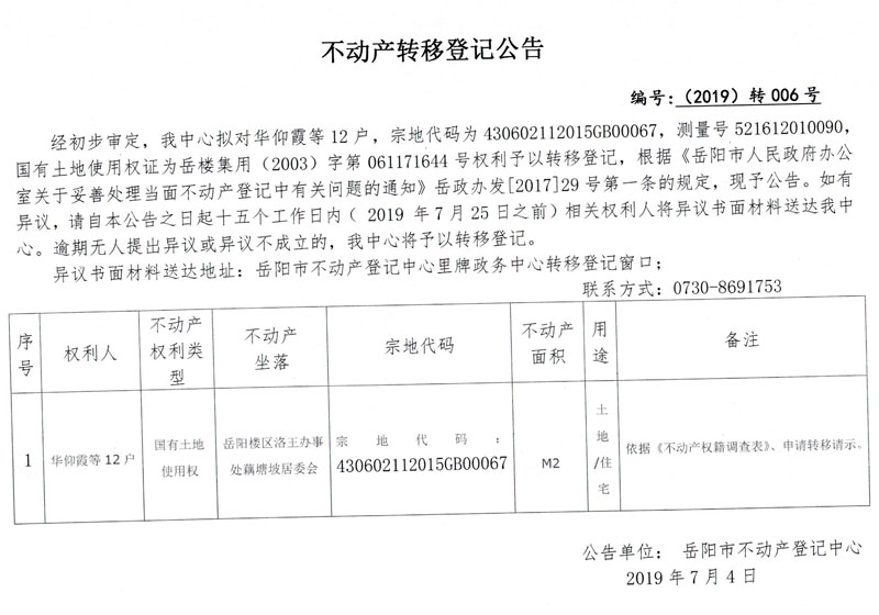 不动产转移登记公告 编号:(2019)转006号(华仰霞等12户)