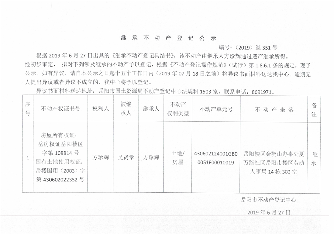 继承不动产登记公示 编号:(2019)继351号(方珍辉)