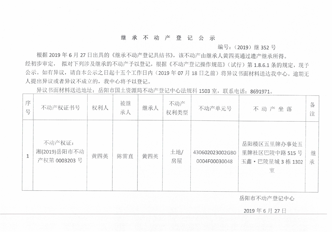 继承不动产登记公示 编号:(2019)继352号(黄四英)