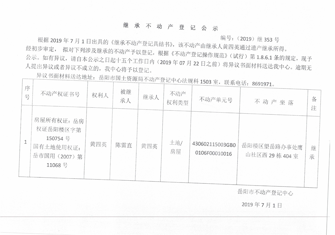 继承不动产登记公示 编号:(2019)继353号(黄四英)