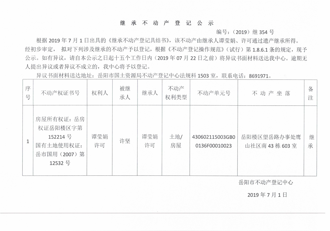 继承不动产登记公示 编号:(2019)继354号(许可)