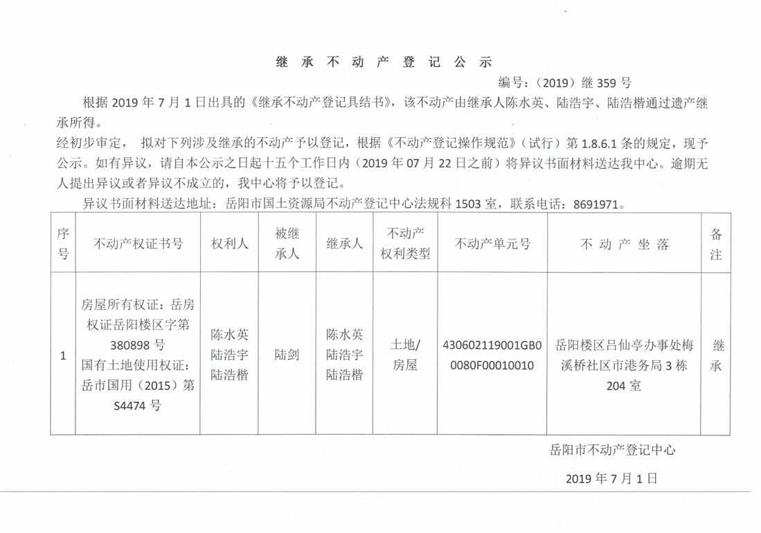 继承不动产登记公示 编号:(2019)继359号(陈水英)