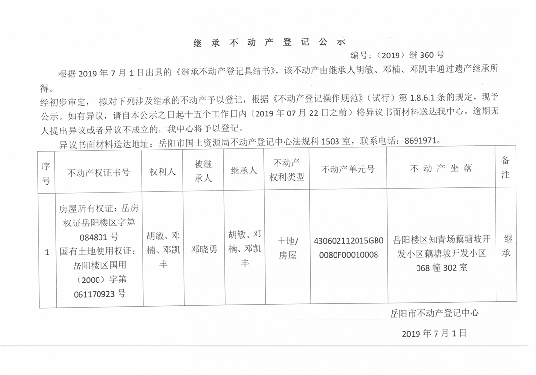 继承不动产登记公示 编号:(2019)继360号(胡敏)