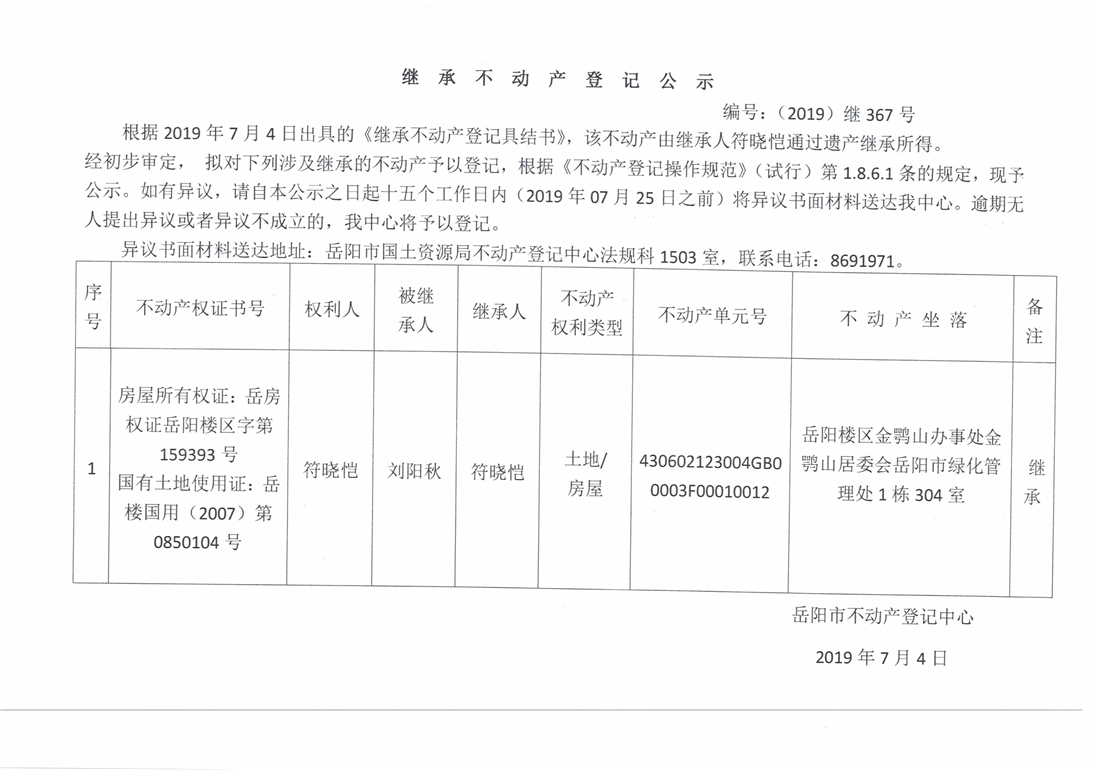 继承不动产登记公示 编号:(2019)继号367号(付晓恺)