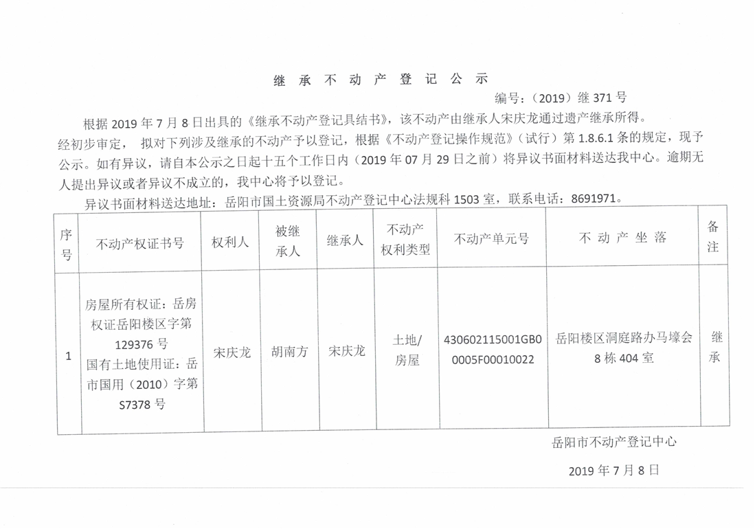 继承不动产登记公示 编号:(2019)继371号(宋庆龙)