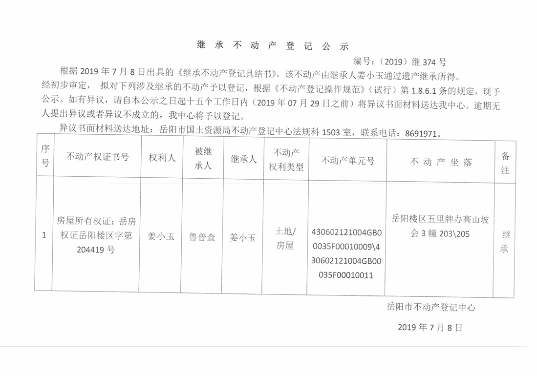 继承不动产登记公示 编号:(2019)继374号(姜小玉)