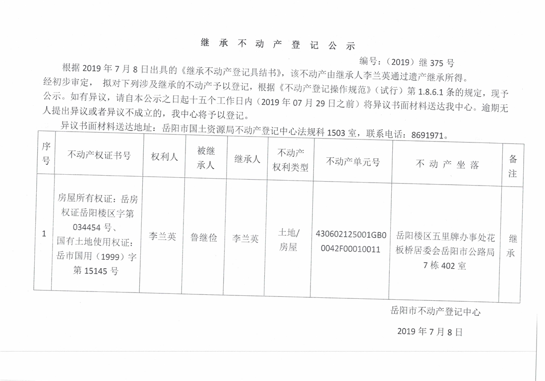 继承不动产登记公示 编号:(2019)继375号(李兰英)