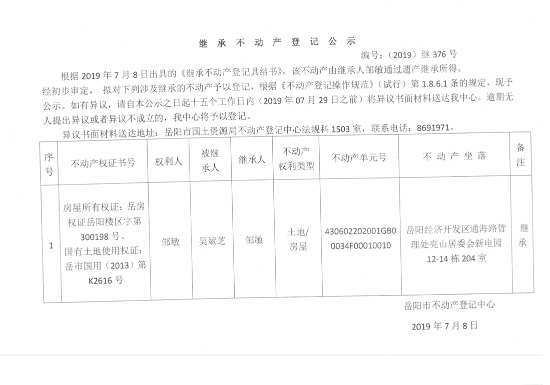 继承不动产登记公示 编号:(2019)继376号(邹敏)