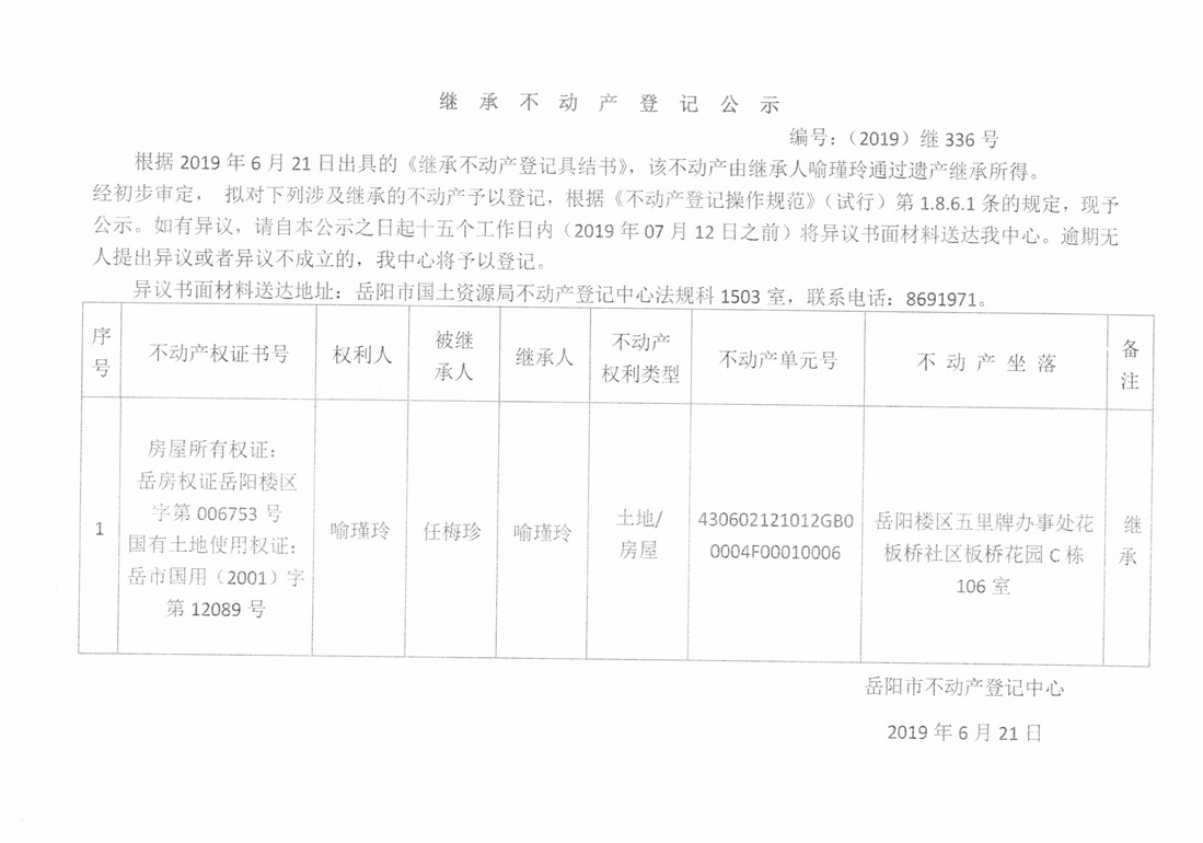 继承不动产登记公示 编号:(2019)继336号(喻瑾玲)