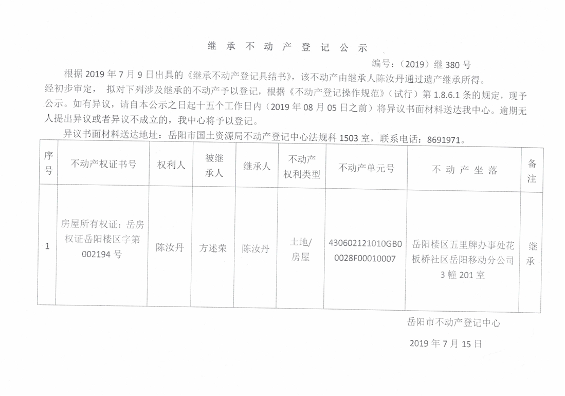 继承不动产登记公示 编号:(2019)继380号(陈汝丹)