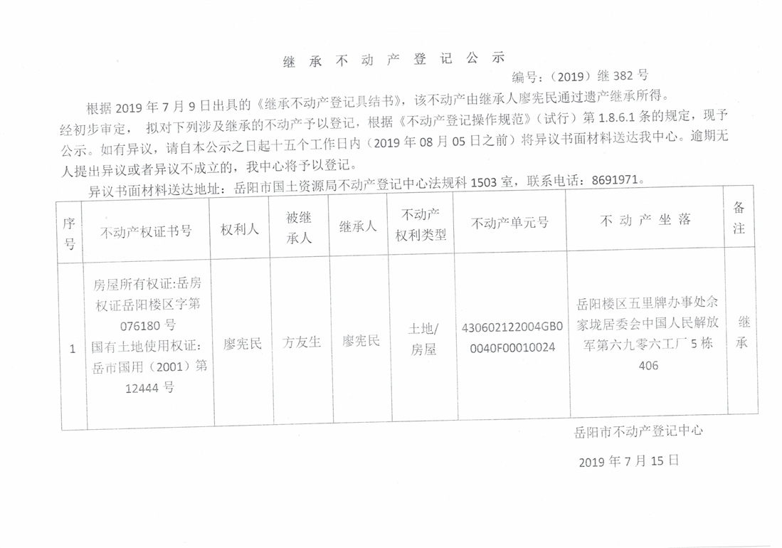 继承不动产登记公示 编号:(2019)继382号(廖宪民)