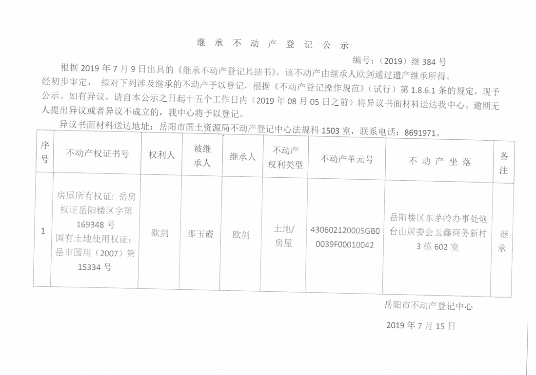 继承不动产登记公示 编号:(2019)继384号(欧剑)