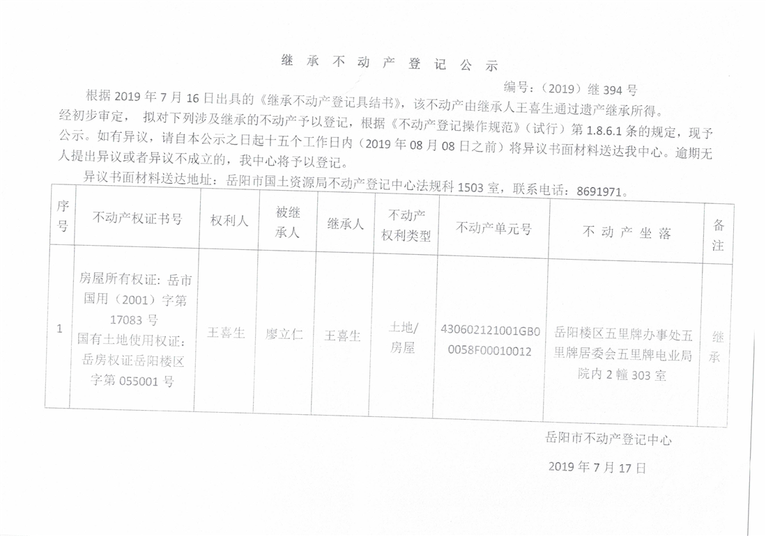 继承不动产登记公示 编号:(2019)继394号(王喜生)