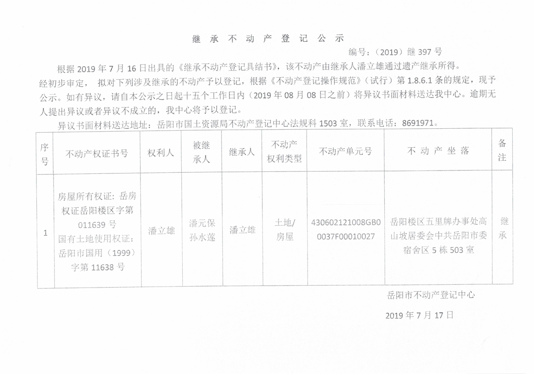 继承不动产登记公示 编号:(2019)继397号(潘立雄)