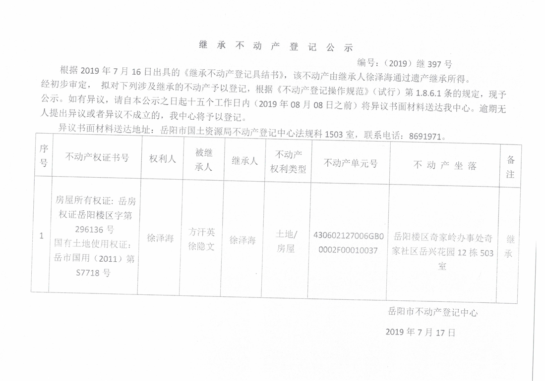 继承不动产登记公示 编号:(2019)继397号(徐泽海)