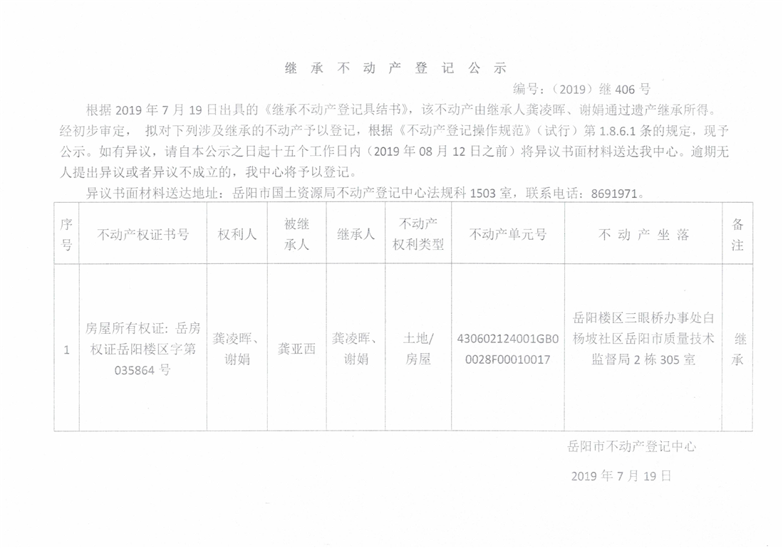 继承不动产登记公示 编号:(2019)继406号(谢娟)