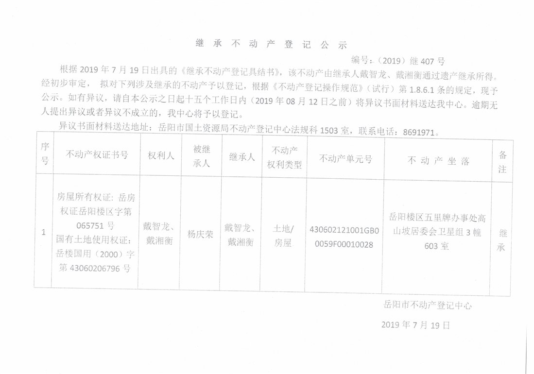 继承不动产登记公示 编号:(2019)继407号(戴湘衡)