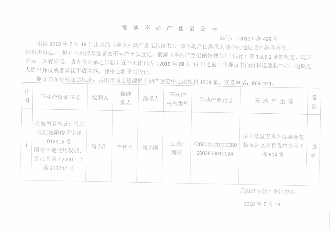 继承不动产登记公示 编号:(2019)继409号(刘小刚)