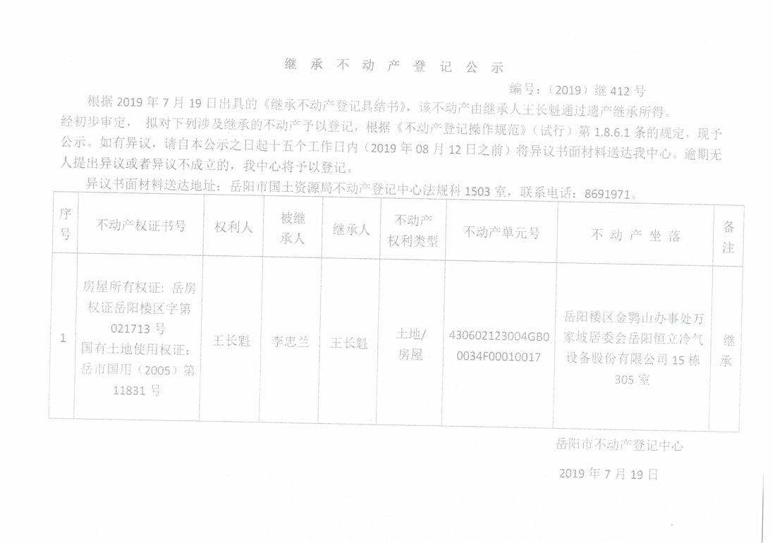 继承不动产登记公示 编号:(2019)继412号(王长魁)