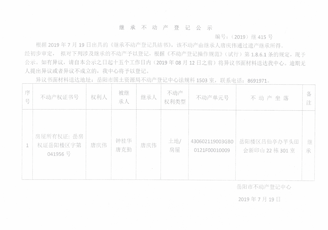 继承不动产登记公示 编号:(2019)继415号(唐庆伟)