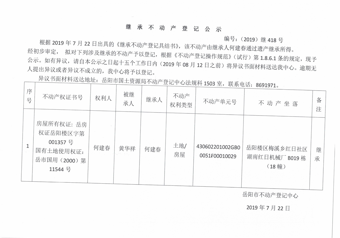 继承不动产登记公示 编号:(2019)继418号(何建春)