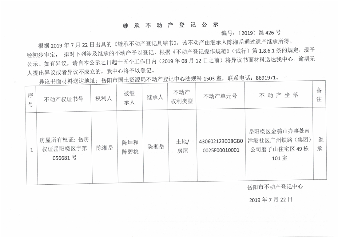 继承不动产登记公示 编号:(2019)继426号(陈湘岳)