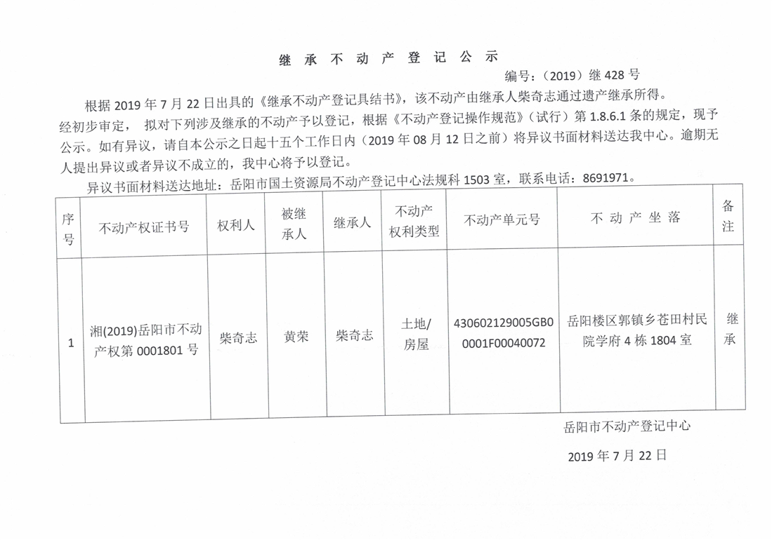 继承不动产登记公示 编号:(2019)继428号(柴奇志)