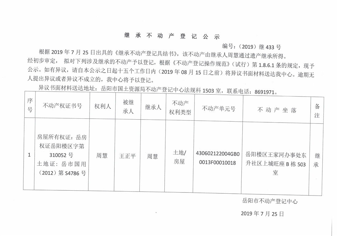 继承不动产登记公示 编号:(2019)继433号(周慧)