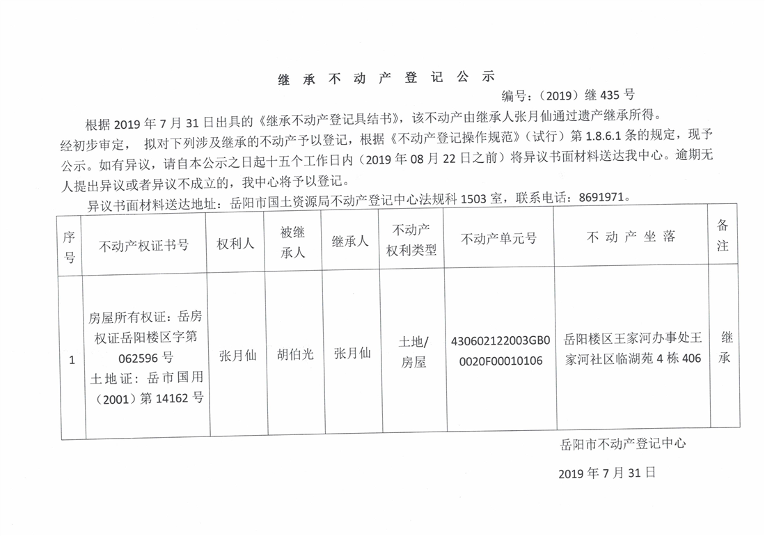 继承不动产登记公示 编号:(2019)继435号(张月仙)
