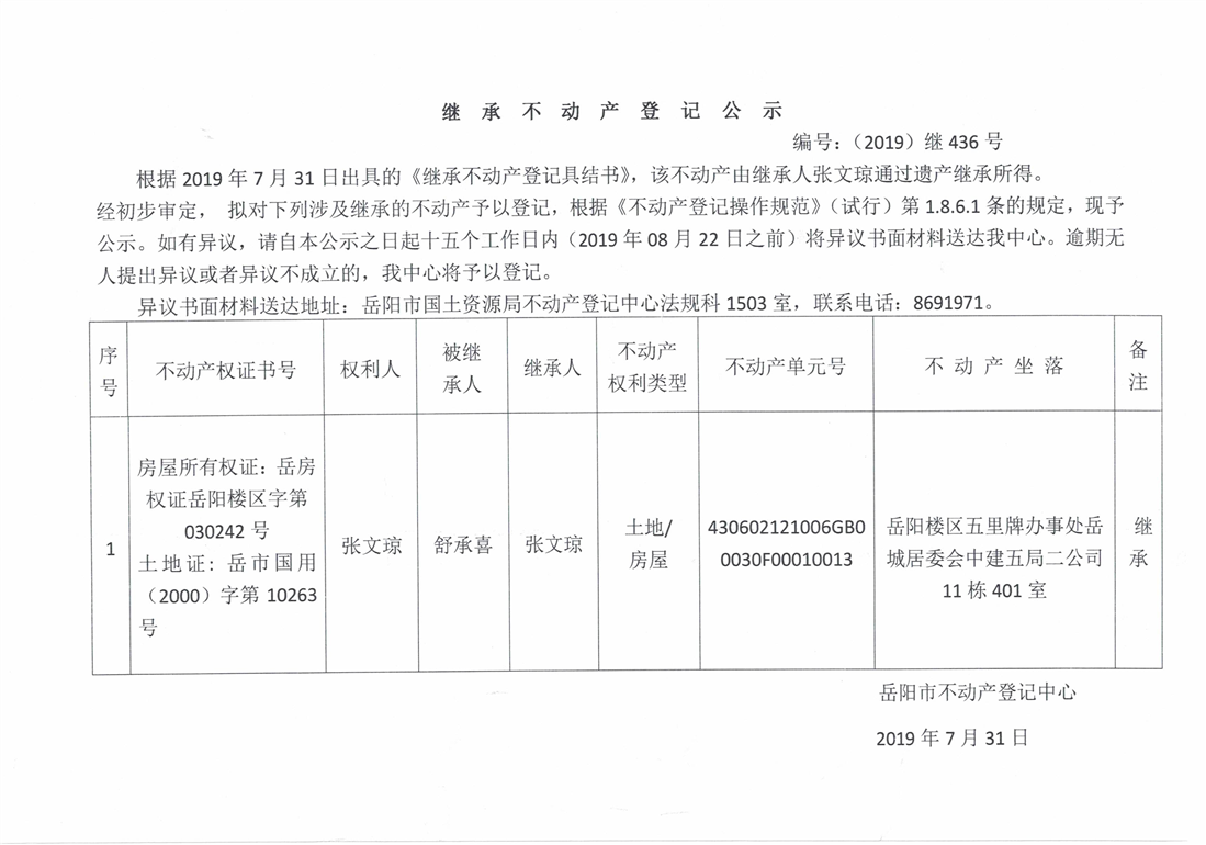 继承不动产登记公示 编号:(2019)继436号(张文琼)