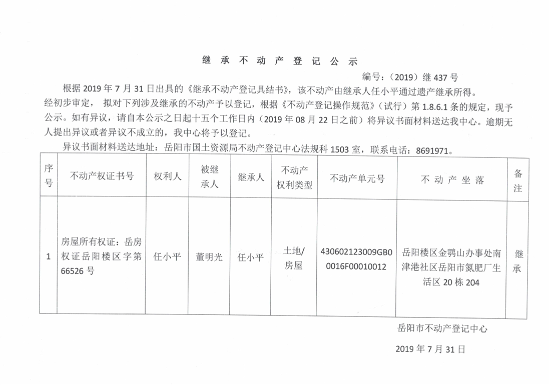 继承不动产登记公示 编号:(2019)继437号(任小平)