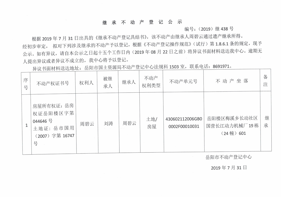 继承不动产登记公示 编号:(2019)继438号(周碧云)