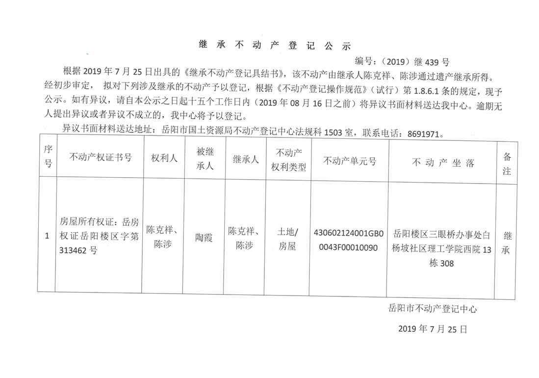 继承不动产登记公示 编号:(2019)继439号(陈涉)