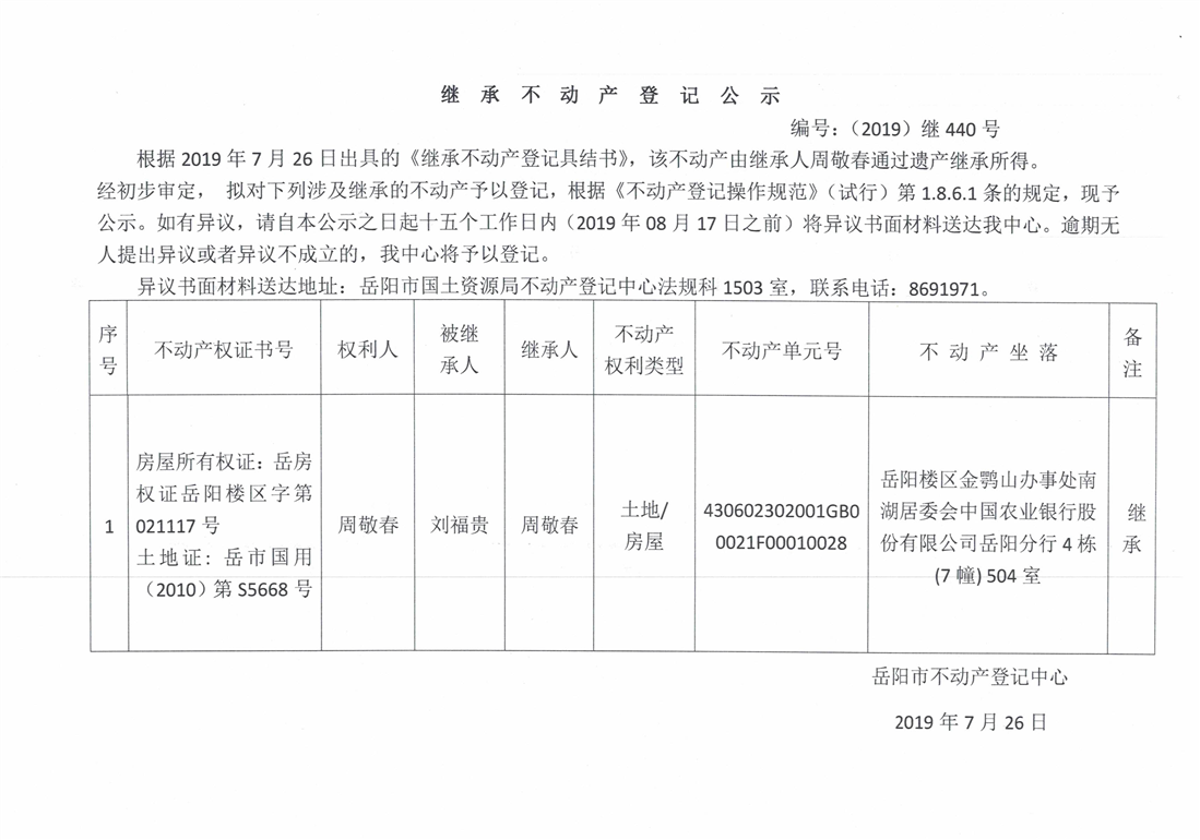 继承不动产登记公示 编号:(2019)继440号