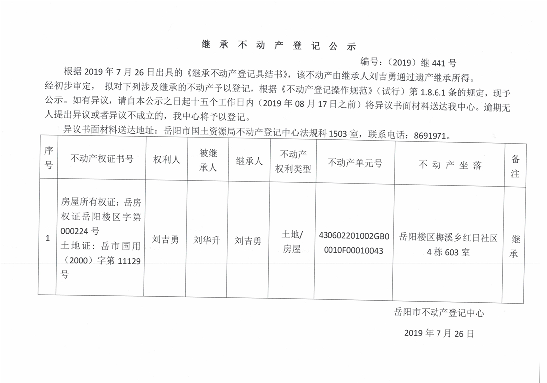 继承不动产登记公示 编号:(2019)继441号(刘吉勇)
