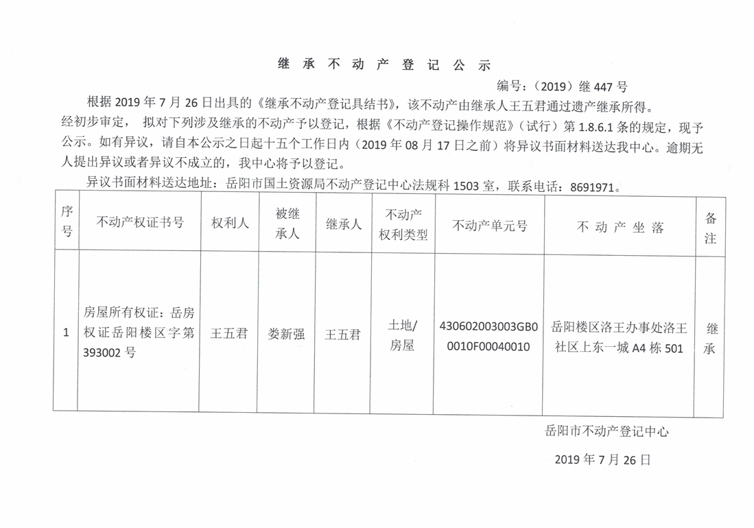 继承不动产登记公示 编号:(2019)继447号(王五君)