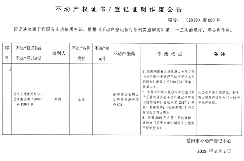不动产权证书、登记证明作废公告 编号: (2019)废098号(刘向,房权证018339号,土地证岳市南国用(2004)第10087号)