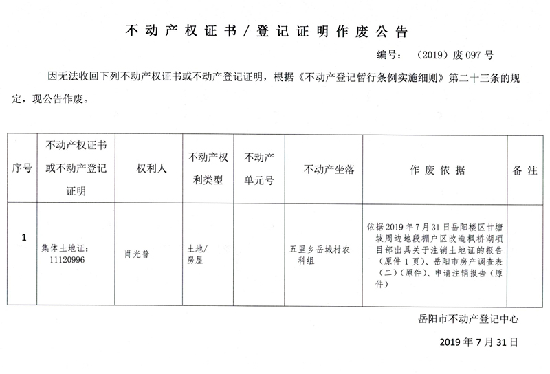 不动产权证书、登记证明作废公告 编号: (2019)废097号(肖光普,集体土地证11120996)