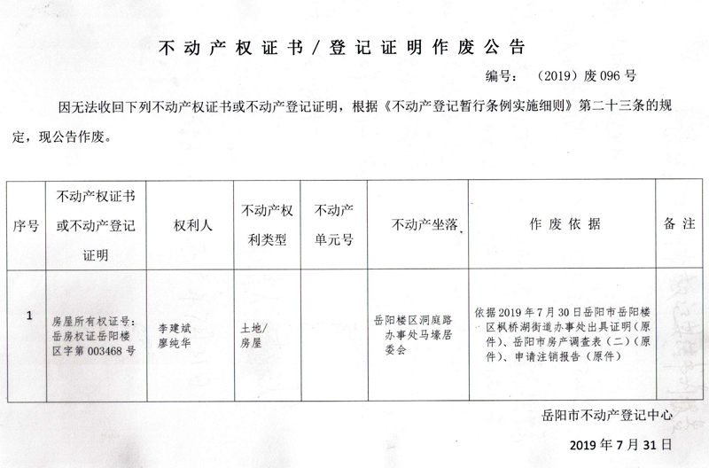 不动产权证书、登记证明作废公告 编号: (2019)废096号(李建斌、廖纯华,房权证003468号)